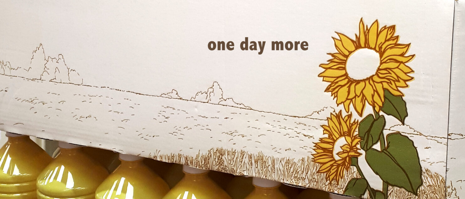 “one day more” est la promesse d’une continuité monotone, avec peu de choses, et au bout du tunnel une petite lumière qui clignote. C’est aussi une marque de céréales polonaises vendues en France à bas prix. Du muesli dur comme des cailloux, quelques baies lyophilisées dont les graines pourraient casser des dents trop fragiles. En guise de compensation, ces céréales sont « adoucies avec des dattes ».
